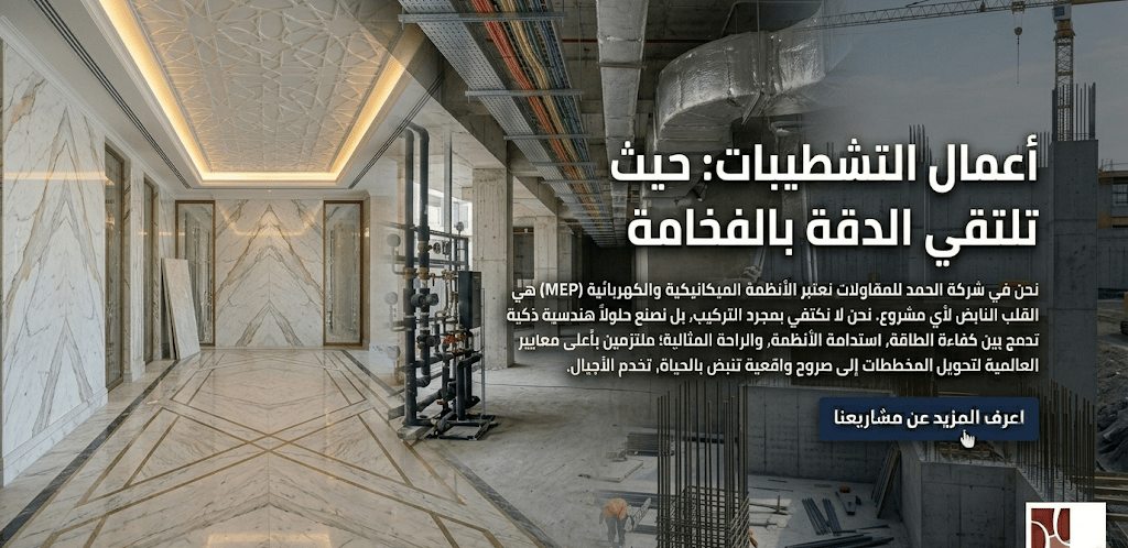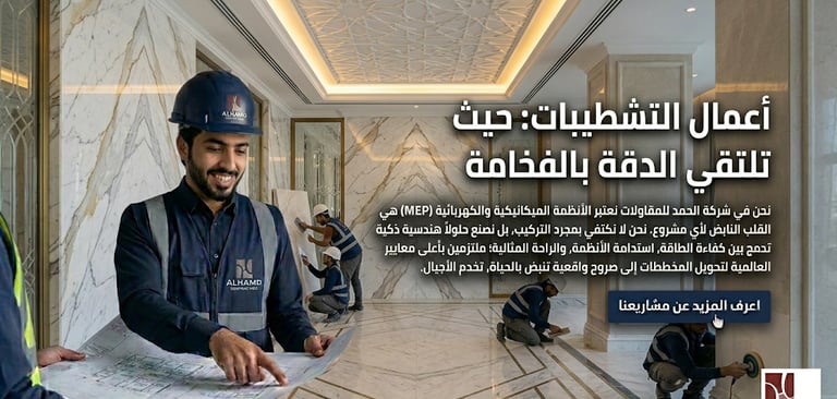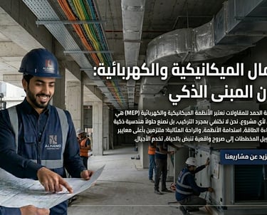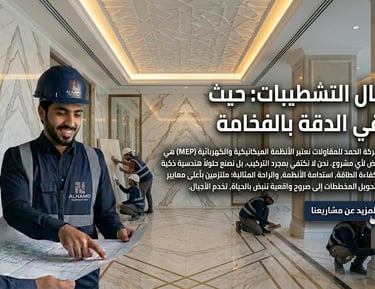 "حلول MEP.. دقة في التخطيط وبراعة في التنفيذ" "في شركة الحمد، نتولى تنفيذ وتأسيس كافة الأنظمة الكهربائية والميكانيكية بأحدث التقنيات. نحن نؤمن بأن تفاصيل العمل 'خلف الجدران' هي ما يحدد جودة المبنى الحقيقية، لذا نضمن لك تنفيذ كافة التمديدات والأنظمة بجودة تدوم طويلاً."