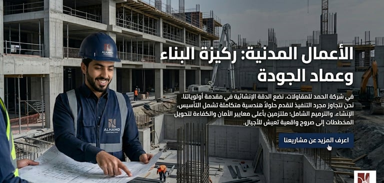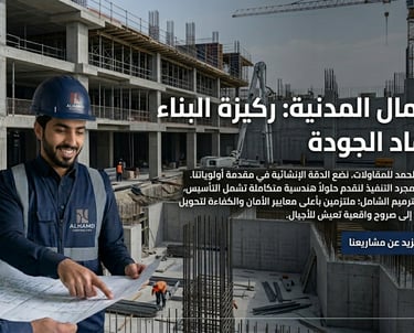 "الأعمال المدنية: ركيزة البناء وعماد الجودة" "في شركة الحمد للمقاولات، نضع الدقة الإنشائية في مقدمة أولوياتنا. نحن نتجاوز مجرد التنفيذ لنقدم حلولاً هندسية متكاملة تشمل التأسيس، الإنشاء، والترميم الشامل؛ ملتزمين بأعلى معايير الأمان والكفاءة لتحويل المخططات إلى صروح واقعية تعيش للأجيال."
